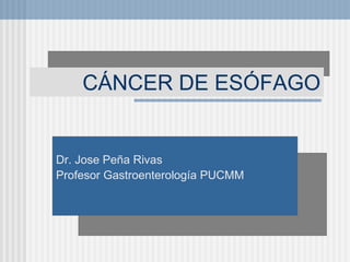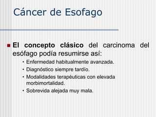 El documento describe el cáncer de esófago, incluyendo su epidemiología, factores de riesgo, manifestaciones clínicas, diagnóstico, estadificación y tratamiento. El cáncer de esófago se presenta más comúnmente en China, Rusia e Irán y los carcinomas epidermoide y adenocarcinoma son los tipos histológicos más frecuentes. El diagnóstico incluye endoscopia, tomografía y estadificación preoperatoria para determinar la resecabilidad del tumor. El tratamiento depende del est