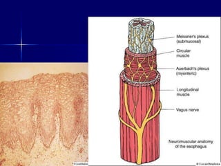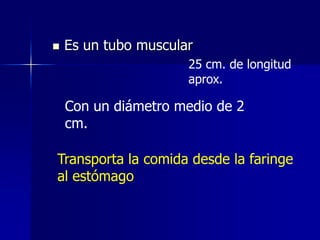 El documento describe la anatomía del esófago. El esófago es un tubo muscular de aproximadamente 25 cm de longitud con un diámetro medio de 2 cm que transporta los alimentos desde la faringe hasta el estómago. Su musculatura cambia de músculo voluntario en la parte superior a músculo liso en la parte inferior. El esófago atraviesa el hiato esofágico del diafragma y termina en el estómago. La irrigación arterial proviene de la arteria esofágica inferior, rama de la arteria g
