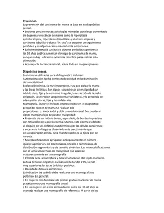 Este documento describe el cáncer de mama, incluyendo su epidemiología, factores de riesgo, prevención, diagnóstico, tipos histológicos, clínica, vías de diseminación, marcadores, factores de mal pronóstico y tratamiento. El cáncer de mama es el tumor maligno más frecuente en mujeres y su incidencia está aumentando. Se debe realizar diagnóstico precoz mediante autoexploración, exploración clínica, mamografía y biopsia para mejorar los resultados del tratamiento.