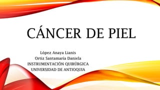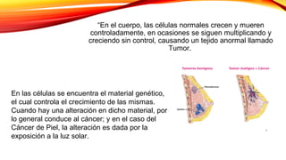 Este documento trata sobre el cáncer de piel. Explica que existen tres tipos principales de cáncer de piel: el carcinoma basocelular, el carcinoma espinocelular y el melanoma. Los dos primeros se conocen como cáncer no melanoma y se originan en las células que rodean los órganos, mientras que el melanoma se produce cuando las células productoras de melanina se vuelven malignas. El documento también analiza las causas del cáncer de piel, como la exposición excesiva a los rayos UV del sol o el contacto