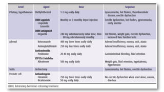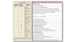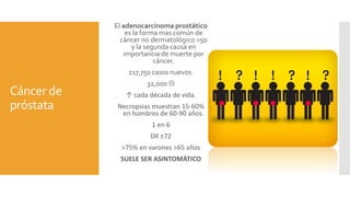 El cáncer de próstata es la forma más común de cáncer no dermatológico en hombres mayores de 50 años y la segunda causa principal de muerte por cáncer. Afecta principalmente a hombres mayores de 65 años y suele ser asintomático. El diagnóstico se realiza mediante biopsia prostática guiada por ultrasonido y los niveles elevados de PSA en sangre. El tratamiento depende del estadio y grado del tumor y puede incluir vigilancia activa, prostatectomía radical o radioterapia.
