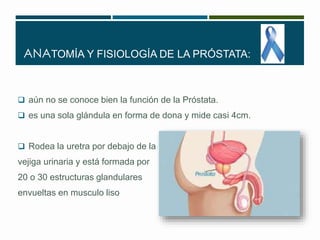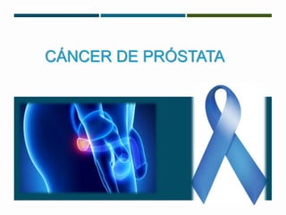 El cáncer de próstata es el tipo más común de cáncer en hombres, caracterizado por el desarrollo de adenocarcinomas a partir de células glandulares en la próstata. Su diagnóstico se realiza principalmente a través de biopsias y el tratamiento varía según el estadio y la salud del paciente, incluyendo cirugía, radioterapia y manipulación hormonal. La farmacoterapia, como la quimioterapia, se utiliza en etapas avanzadas y se basa en la privación de andrógenos, aunque puede tener efectos secundarios significativos.