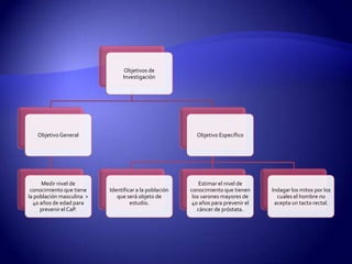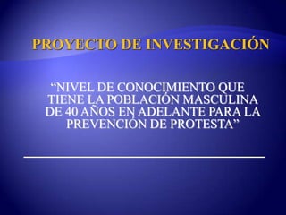 Este documento presenta un proyecto de investigación sobre el nivel de conocimiento de la población masculina mayor de 40 años sobre la prevención del cáncer de próstata. La introducción explica que el cáncer de próstata es común en hombres mayores de 60 años. El problema de investigación es determinar el conocimiento de los hombres sobre la próstata, su función y el riesgo de cáncer. La justificación es que aproximadamente uno de cada tres hombres tendrá cáncer de próstata antes de los 80 años. El documento clasificará las variables e