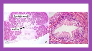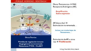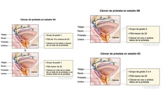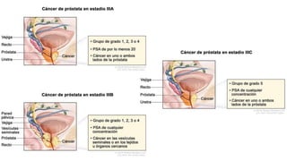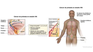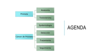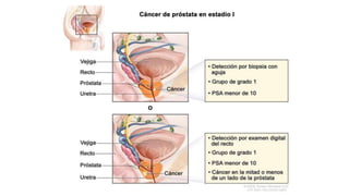 El documento proporciona información sobre el cáncer de próstata, incluyendo su epidemiología, métodos de detección y tratamiento. El cáncer de próstata es el segundo cáncer más común en hombres y la cuarta causa principal de cáncer en general. La detección incluye el cuestionario de síntomas prostáticos, tacto rectal y medición del antígeno prostático específico. El tratamiento depende del estadio y puede incluir cirugía, radioterapia o terapia hormonal.