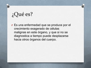 El cáncer de pulmón es una enfermedad causada por el crecimiento anormal de células en los pulmones que puede extenderse a otros órganos si no se trata. Sus principales causas son el tabaco, la exposición a carcinógenos y factores genéticos. Los síntomas incluyen tos, dolor en el pecho, sangre al toser y falta de aliento. La mejor forma de prevenirlo es no fumar ni estar expuesto al humo de tabaco. Se trata principalmente con cirugía, quimioterapia y radioter