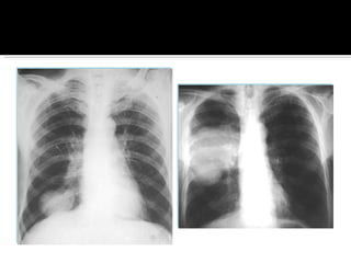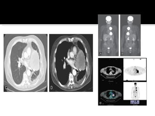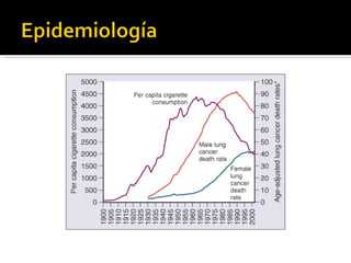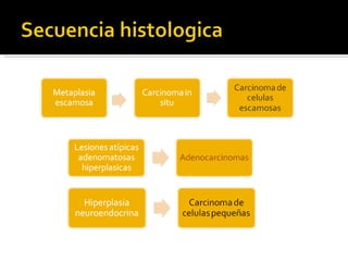 El documento proporciona información sobre los diferentes tipos y características del cáncer de pulmón no microcítico. El tabaquismo es la principal causa y aumenta el riesgo de cáncer de pulmón en 20 veces. Los síntomas incluyen tos, disnea y dolor. El diagnóstico incluye exámenes de imagen, biopsias y pruebas de laboratorio. El tratamiento depende del estadio y puede incluir cirugía, quimioterapia y radioterapia. Los factores pronósticos incluyen el t