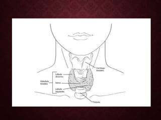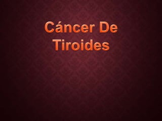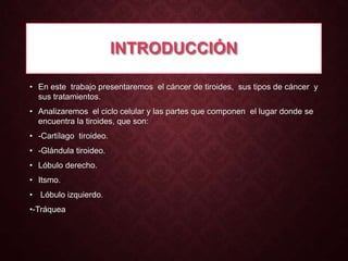El documento describe el cáncer de tiroides, incluyendo sus tipos principales (papilar, folicular, anaplásico y medular), síntomas, diagnóstico, tratamiento y ciclo celular. Explica que la mayoría de los cánceres de tiroides no presentan síntomas pero pueden detectarse como un bulto en el cuello. El diagnóstico se realiza mediante biopsia de nódulos y el tratamiento depende del tipo y grado, e incluye cirugía, radioterapia, yodo radiactivo