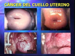 Este documento trata sobre el cáncer de cuello uterino. Resume la epidemiología, factores de riesgo, diagnóstico, estadificación y tratamiento de esta enfermedad. Explica que el cáncer de cuello uterino es un problema de salud pública y la cuarta causa de muerte por cáncer en Perú. Los factores de riesgo incluyen infecciones por VPH, número de parejas sexuales, edad y tabaquismo. El diagnóstico se realiza mediante Papanicolaou y colposcopía. Existen