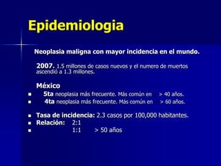 Este documento trata sobre el cáncer de pulmón. Es la neoplasia maligna con mayor incidencia en el mundo y la principal causa de muerte por cáncer. En México es la quinta neoplasia más frecuente y la cuarta causa de muerte por cáncer. El tabaquismo causa el 80% de los casos. Los principales tipos histológicos son el adenocarcinoma, el carcinoma de células escamosas y el carcinoma de células pequeñas.