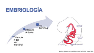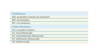 El documento presenta información sobre el cáncer gástrico, incluyendo su embriología, anatomía, irrigación, inervación, histología, fisiología, epidemiología, factores de riesgo, clasificación, estadificación, síntomas, diagnóstico y estadificación. Se describe el cáncer gástrico desde perspectivas anatómicas, histológicas y clínicas, y se discuten temas como su epidemiología, factores de riesgo, clasificación histológica, síntomas, mé
