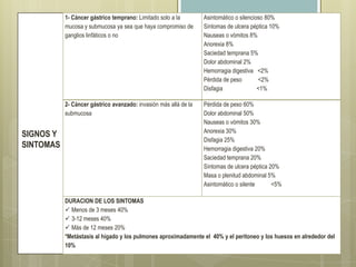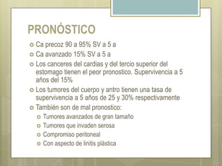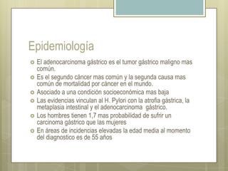 La infección por H. pylori es un importante factor de riesgo para el desarrollo de cáncer gástrico. El documento describe cómo la infección por H. pylori causa gastritis crónica, atrofia gástrica y metaplasia intestinal, lo que puede conducir eventualmente a la formación de adenocarcinoma gástrico. También señala que la erradicación temprana de H. pylori puede ayudar a prevenir la progresión a cáncer gástrico.