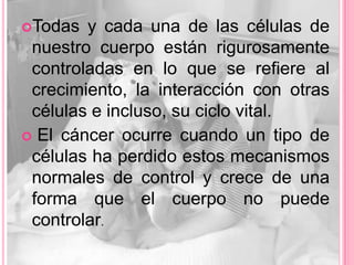 El cáncer infantil ocurre cuando las células pierden su control normal y crecen de forma descontrolada, consumiendo los nutrientes del cuerpo y debilitándolo. Los tipos más comunes son la leucemia, el linfoma y el cáncer cerebral. Cada tipo afecta partes diferentes del cuerpo y tiene distintos tratamientos y tasas de curación. Los tratamientos incluyen quimioterapia, radioterapia y cirugía, pero pueden causar efectos secundarios. Una recuperación saludable requiere dieta, descanso y apo
