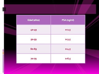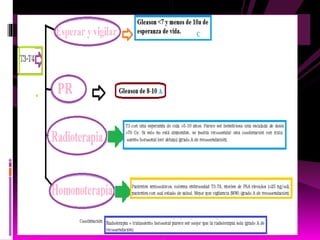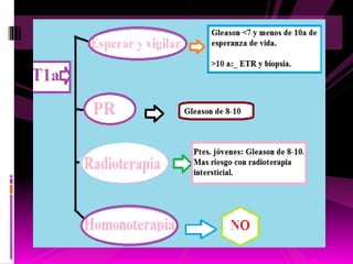 El documento presenta información sobre el cáncer de próstata, incluyendo factores de riesgo como la edad y dieta, síntomas, diagnóstico mediante tacto rectal, antígeno prostático específico y biopsias, gradación histopatológica, estadificación, y opciones de tratamiento como prostatectomía radical, radioterapia, braquiterapia y terapia hormonal.