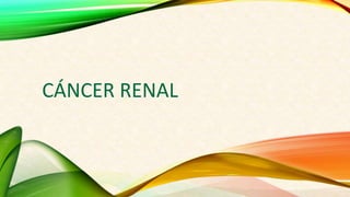 Este documento describe el cáncer renal, incluyendo los factores de riesgo como el tabaquismo y la obesidad, los síntomas como la sangre en la orina y la pérdida de peso, y los cinco tipos histológicos principales. Generalmente, el cáncer renal se diagnostica mediante tomografía computarizada, resonancia magnética o ultrasonido, y a menudo se ha extendido a los pulmones u otros órganos en las etapas avanzadas de la enfermedad.