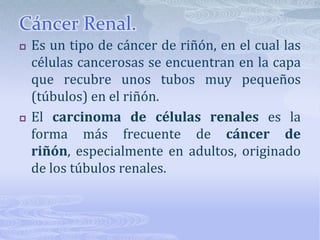 El documento trata sobre el cáncer renal. Explica que el cáncer renal se origina cuando las células de uno o ambos riñones empiezan a crecer sin control, formando un tumor canceroso. Luego describe los principales tipos de cáncer renal, incluyendo el carcinoma de células renales (85% de los casos), carcinoma de células de transición (10-15% de los casos), y sarcoma y tumor de Wilms (menos frecuentes). Finalmente, detalla algunos síntomas, diagnósticos, tratamientos y dominios alterados relacion