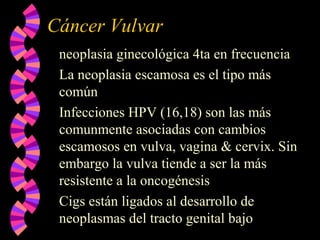 Este documento resume la información sobre el cáncer de vulva. Explica que el cáncer escamoso es el tipo más común, y que las infecciones por HPV son las causas más comunes. Detalla las etapas del cáncer de vulva según la clasificación FIGO, así como los síntomas, diagnóstico y tratamientos disponibles que incluyen cirugía, radioterapia y quimioterapia.