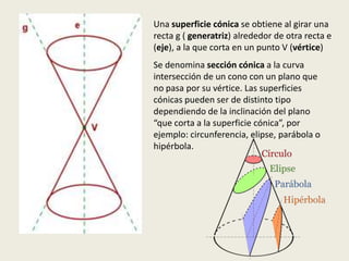 El documento describe las cuatro cónicas principales: la elipse, la hipérbola, la circunferencia y la parábola. Explica cómo se obtienen cada una al cortar una superficie cónica con un plano y define sus elementos característicos. También presenta las ecuaciones geométricas de cada curva cónica y desarrolla las propiedades que permiten derivar dichas ecuaciones.