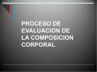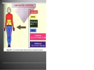 El documento aborda la composición corporal, analizando sus componentes, variaciones y métodos de medición, y su importancia en la evaluación del estado nutricional. Se describen diferentes técnicas como antropometría y bioimpedancia, además de modelos matemáticos para la estimación de la composición corporal. También se discuten las variaciones en la composición a lo largo de la vida y su relación con la salud.