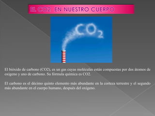 El documento describe las propiedades y funciones del dióxido de carbono (CO2) en el cuerpo humano. El CO2 se produce como subproducto del metabolismo y se transporta a través de la sangre, donde se convierte en bicarbonato e hidrogeniones y es eliminado a través de los pulmones o los riñones. El CO2 juega un papel importante en la regulación del pH de la sangre y la vasodilatación. Niveles anormalmente altos de CO2 en la sangre pueden causar hipercapnia y varios síntomas graves.