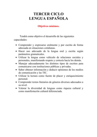 El documento presenta los objetivos mínimos para varias asignaturas del tercer ciclo de educación primaria en España. Los objetivos se enfocan en desarrollar capacidades relacionadas con el lenguaje, las matemáticas, el conocimiento del medio, la educación artística y la educación para la ciudadanía. También incluye criterios de evaluación para cada asignatura.