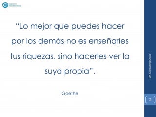 El documento proporciona una definición de coaching. Explica que el coaching es un proceso que fomenta el autoconocimiento y la motivación para la transformación, orientando al individuo a alinearse con las necesidades y resultados esperados de la organización. También describe los diferentes tipos de coaching y características del coaching y el coach.