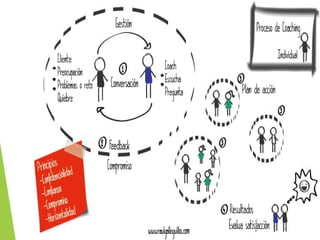 El documento proporciona una introducción al coaching. Explica que el coaching se enfoca en mejorar el liderazgo dentro de las empresas a través de procesos que desarrollan las habilidades de los empleados. También describe algunas características clave del coaching como ser interactivo, centrarse en resultados concretos y requerir responsabilidad compartida entre el coach y el empleado. Finalmente, explica que el coaching busca inspirar a los equipos a lograr objetivos trascendentales a través de la visión y los valores compartidos.