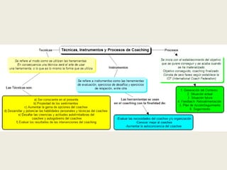 El documento presenta técnicas, instrumentos y procesos de coaching que facilitan la autoconciencia, el desarrollo de habilidades y la responsabilidad del coachee. Se describen seis fases del proceso de coaching definido por la ICF, que incluyen la generación del contexto, evaluación de la situación actual y futura, retroalimentación, planificación de acción y seguimiento. Se enfatiza la importancia de evaluar los resultados de las intervenciones para garantizar la eficacia del proceso.