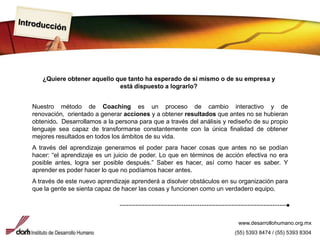 El documento describe un programa de coaching ejecutivo centrado en la transformación personal y organizacional, que busca desarrollar habilidades y competencias para mejorar el rendimiento y la colaboración en equipo. A través de un proceso sistemático, los participantes aprenden a autogestionarse y disolver obstáculos, fomentando una cultura de compromiso y comunicación efectiva. Los objetivos incluyen la creación de equipos de alto rendimiento y un enfoque en el aprendizaje continuo para lograr resultados extraordinarios.