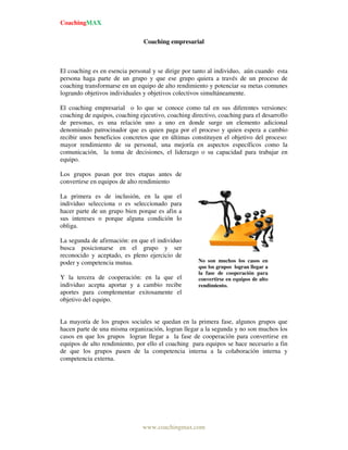 1) El coaching empresarial se enfoca en mejorar el rendimiento individual y de equipos en una empresa mediante el desarrollo de habilidades como la comunicación, toma de decisiones y liderazgo.