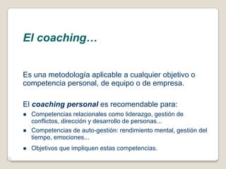 Este documento describe un programa de coaching de equipo para ayudar a los equipos directivos y de mandos intermedios a mejorar sus competencias y objetivos. El programa consiste en sesiones de coaching para analizar la situación actual, establecer objetivos y desarrollar un plan de acción. El objetivo final es impulsar un cambio cultural en la empresa mediante el desarrollo de las habilidades del equipo directivo y la participación de todos los empleados.