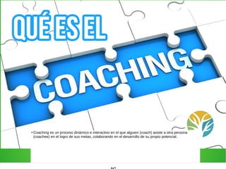 El coaching es un proceso dinámico e interactivo en el que un coach asiste a otra persona en lograr sus metas y desarrollar su potencial. Existen diferentes tipos de coaching como el coaching personal para el bienestar general, el coaching organizacional para mejorar empresas, y el coaching deportivo para motivar y desarrollar el potencial de los atletas.