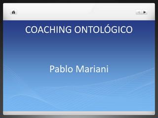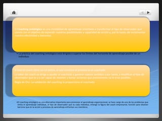 El coaching ontológico es una modalidad de aprendizaje orientada a transformar la perspectiva de un individuo para expandir sus posibilidades de acción. Se enfoca en superar los límites del aprendizaje de una persona mediante la generación de nuevos significados que modifiquen el tipo de observador. El proceso consta de tres etapas: introducción, interpretación e intervención, con el objetivo de producir un cambio en la persona que le permita resolver su problema.