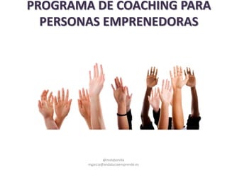 Este documento presenta un programa de coaching para personas emprendedoras. El objetivo del programa es descubrir y desarrollar las capacidades de los participantes, aprender a gestionar las emociones, adquirir herramientas de coaching personal y empresarial, y lograr alcanzar objetivos definidos. El programa abarca temas como la actitud emprendedora, habilidades y competencias, y la elaboración de un plan de acción.