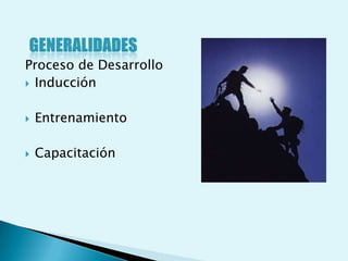 El documento describe el proceso de coaching y los roles de un entrenador. El coaching implica una conversación entre un entrenador y un pupilo para mejorar el desempeño a través del aprendizaje y cambio de conducta. Un entrenador actúa como líder inspirador, seleccionador de talentos, y motivador para mejorar el desempeño individual y de equipo.