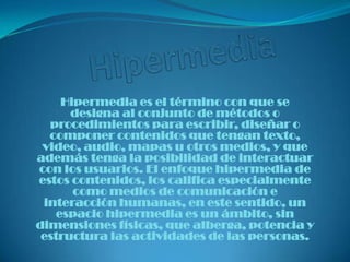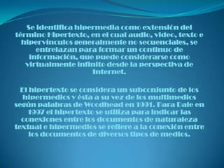 Hipermedia se refiere al uso de varios medios como texto, video y audio que están interconectados y permiten la interacción del usuario. Se identifica como una extensión del hipertexto, donde los elementos multimedia están enlazados de forma no secuencial. El hipertexto surgió originalmente como una idea de Vannevar Bush en 1945 para mejorar la forma en que la información es almacenada y clasificada, al permitir vínculos no lineales entre documentos.