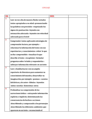 Este documento presenta objetivos de aprendizaje relacionados con la lectura, escritura, lenguaje oral, ciencias naturales y matemáticas para estudiantes de primer año básico. Los objetivos incluyen desarrollar habilidades de lectura en voz alta, comprensión lectora, escritura creativa y correcta de diferentes tipos de textos, comunicación oral, conocimientos básicos de ciencias como ecosistemas y fuerzas, y operaciones matemáticas como adición, sustracción, multiplicación y división. En total se describen 28