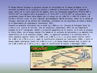El documento describe el Parque Natural Chicaque ubicado en Bogotá, Colombia. Presenta información sobre la ubicación, características físicas, flora y fauna del parque. También resume brevemente la cultura Chibcha precolombina y las actividades económicas actuales en las áreas circundantes al parque.