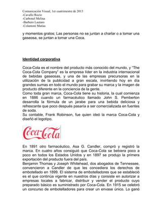 Este documento resume la marca Coca-Cola. Detalla su identidad corporativa y signos de identidad, incluyendo su tipografía exclusiva en rojo y blanco. Explica que es la marca líder mundial de bebidas sin alcohol y cómo ha mantenido su éxito a través de estrictos estándares de calidad. También analiza su planificación estratégica, incluyendo su enfoque en la responsabilidad social y el apoyo al deporte. Finalmente, categoriza a Coca-Cola como una marca verbal compuesta e icónica diagramática.