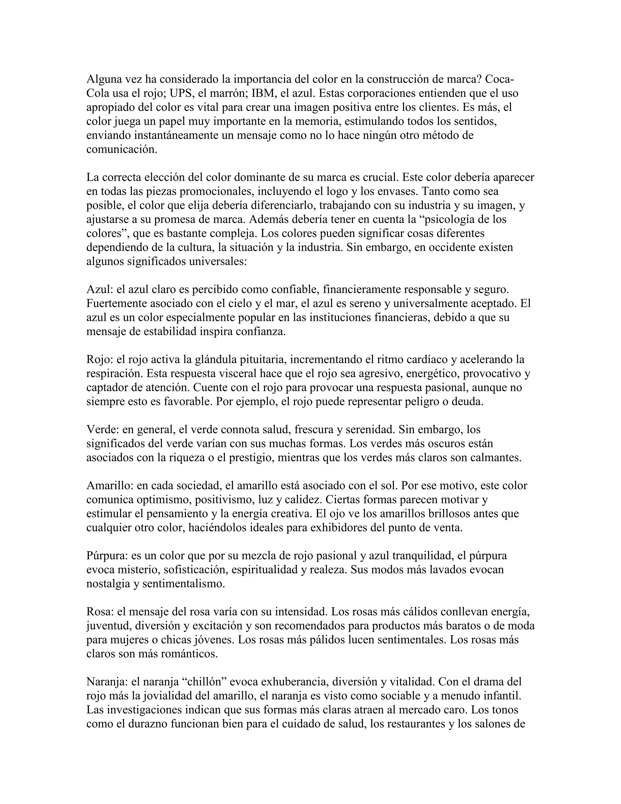 Las corporaciones entienden que el uso apropiado del color es vital para crear una imagen positiva entre los clientes. La elección del color dominante de una marca es crucial, ya que este color debería aparecer en todas las piezas promocionales e identificar la marca de manera única. Los colores pueden tener significados diferentes dependiendo de la cultura, pero existen algunos significados universales como que el azul transmite confianza, el rojo captura la atención de manera energética y el verde connota salud y frescura.