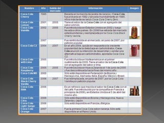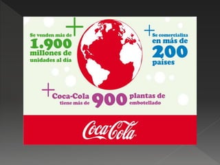 La Coca-Cola fue creada en 1886 por John Pemberton en Atlanta, Georgia como un remedio para el dolor de cabeza y la sed. Frank Robinson le puso el nombre Coca-Cola y diseñó el logotipo actual. Más tarde, la empresa fue comprada y Coca-Cola se expandió a todo el mundo, convirtiéndose en una de las marcas más valiosas.