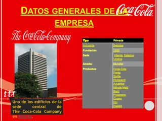 La misión de The Coca-Cola Company es refrescar al mundo, inspirar momentos de optimismo y felicidad, y crear valor y marcar la diferencia. Su visión incluye ser un buen lugar para trabajar, ofrecer una variedad de bebidas de calidad, desarrollar una red de socios, ser responsable con el planeta, maximizar los beneficios para los accionistas de manera sostenible, y ser una organización eficaz. Los valores que guían a la empresa son el liderazgo, la colaboración, la integridad, la rendición de