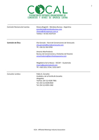 Este documento presenta la Comisión Directiva de COCAL para el período 2012-2014, incluyendo los nombres y contactos de la Presidenta, los dos Vicepresidentes, el Secretario General, el Prosecretario, el Tesorero, el Vocal 1o y la Comisión Revisora de Cuentas. También nombra a los miembros de la Comisión de Ética y al Consultor Jurídico.