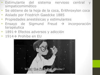 La cocaína es un estimulante del sistema nervioso central obtenido de la hoja de coca. Inhibe la recaptación de dopamina y noradrenalina, causando euforia y otros efectos. Puede consumirse de varias formas, como hojas de coca, clorhidrato de cocaína, crack o base libre. La intoxicación aguda se caracteriza por manifestaciones cardiovasculares, respiratorias y neurológicas. No existe un tratamiento biológico, por lo que se utilizan enfoques conductuales y grupales