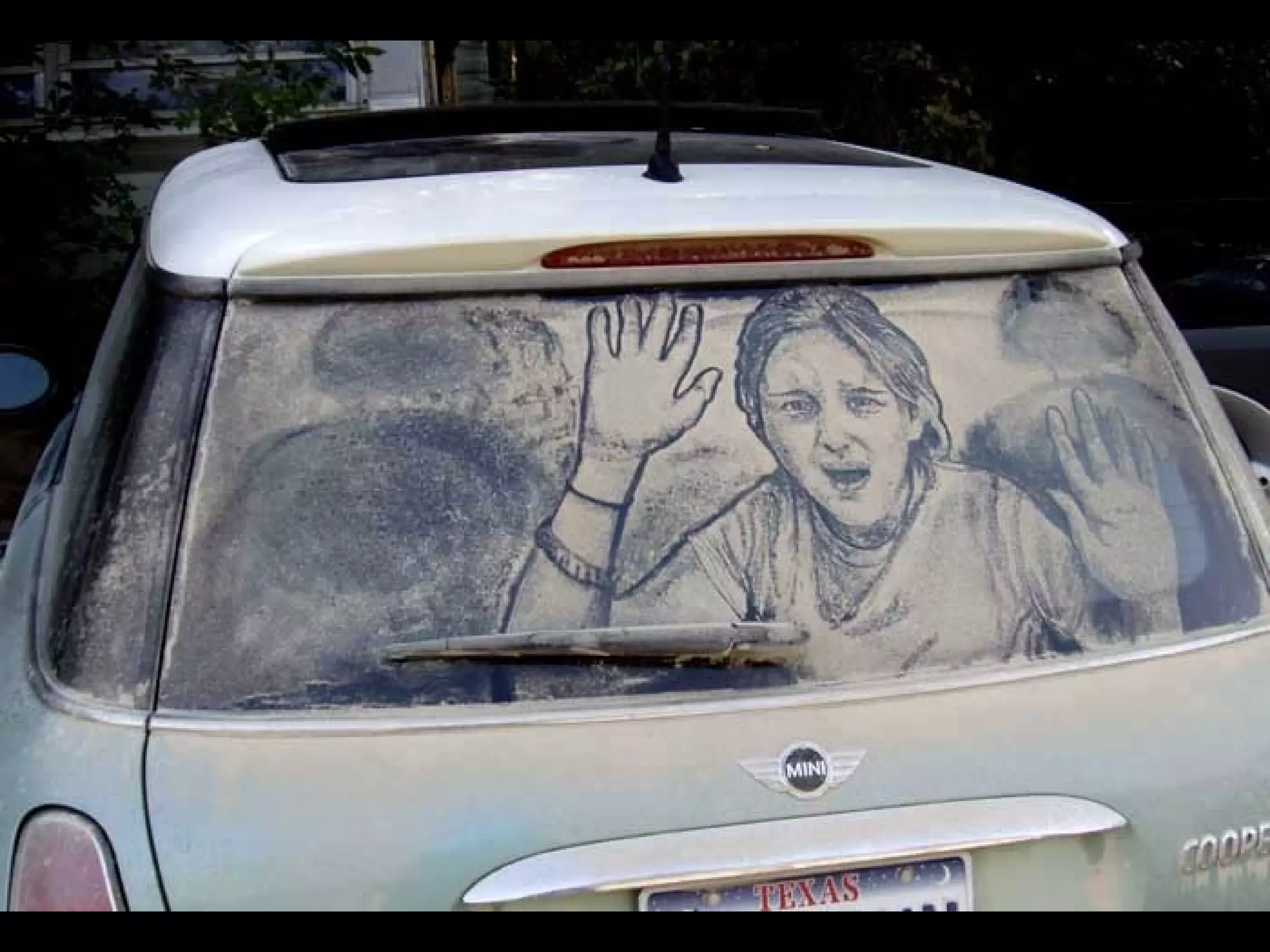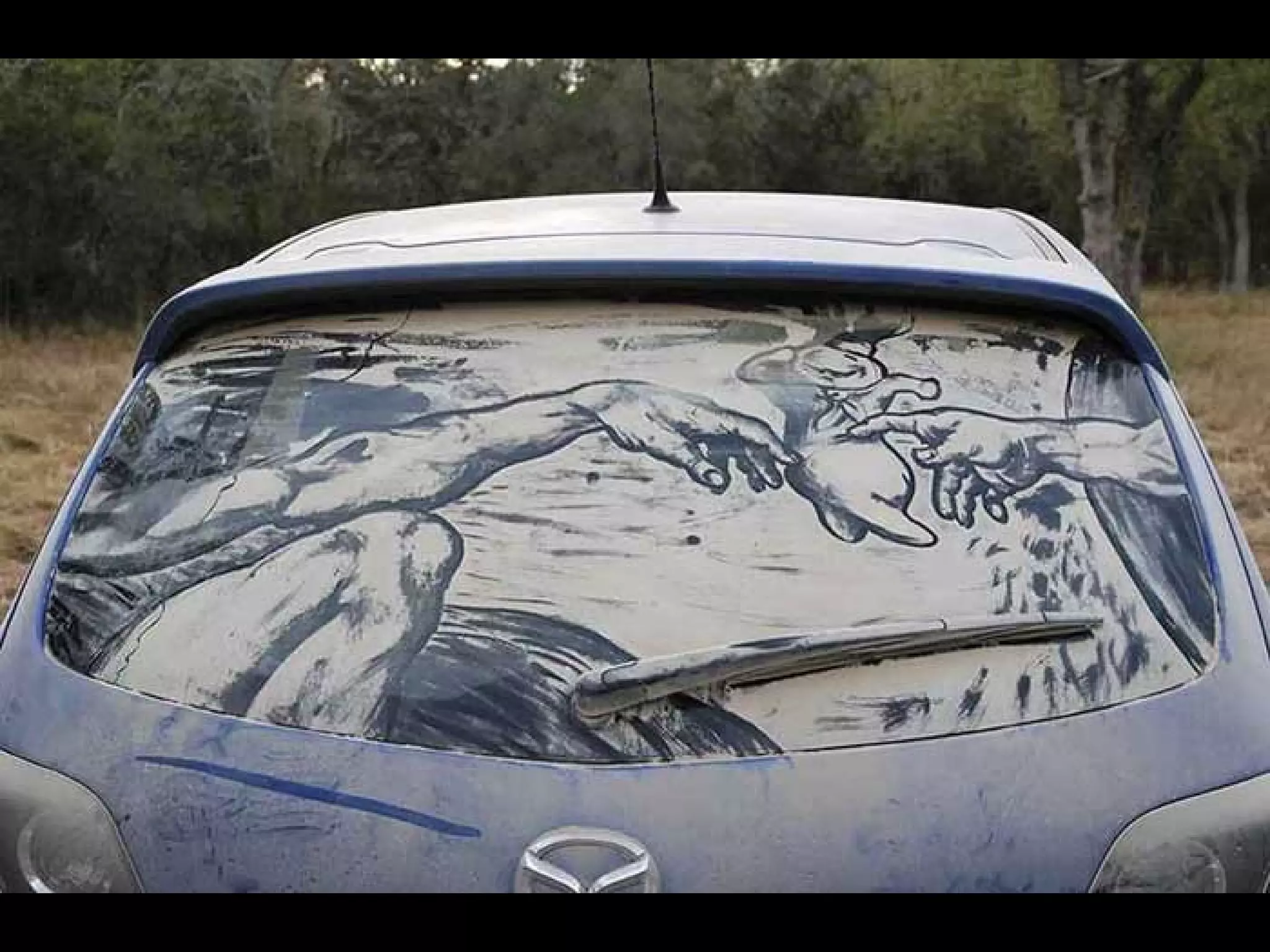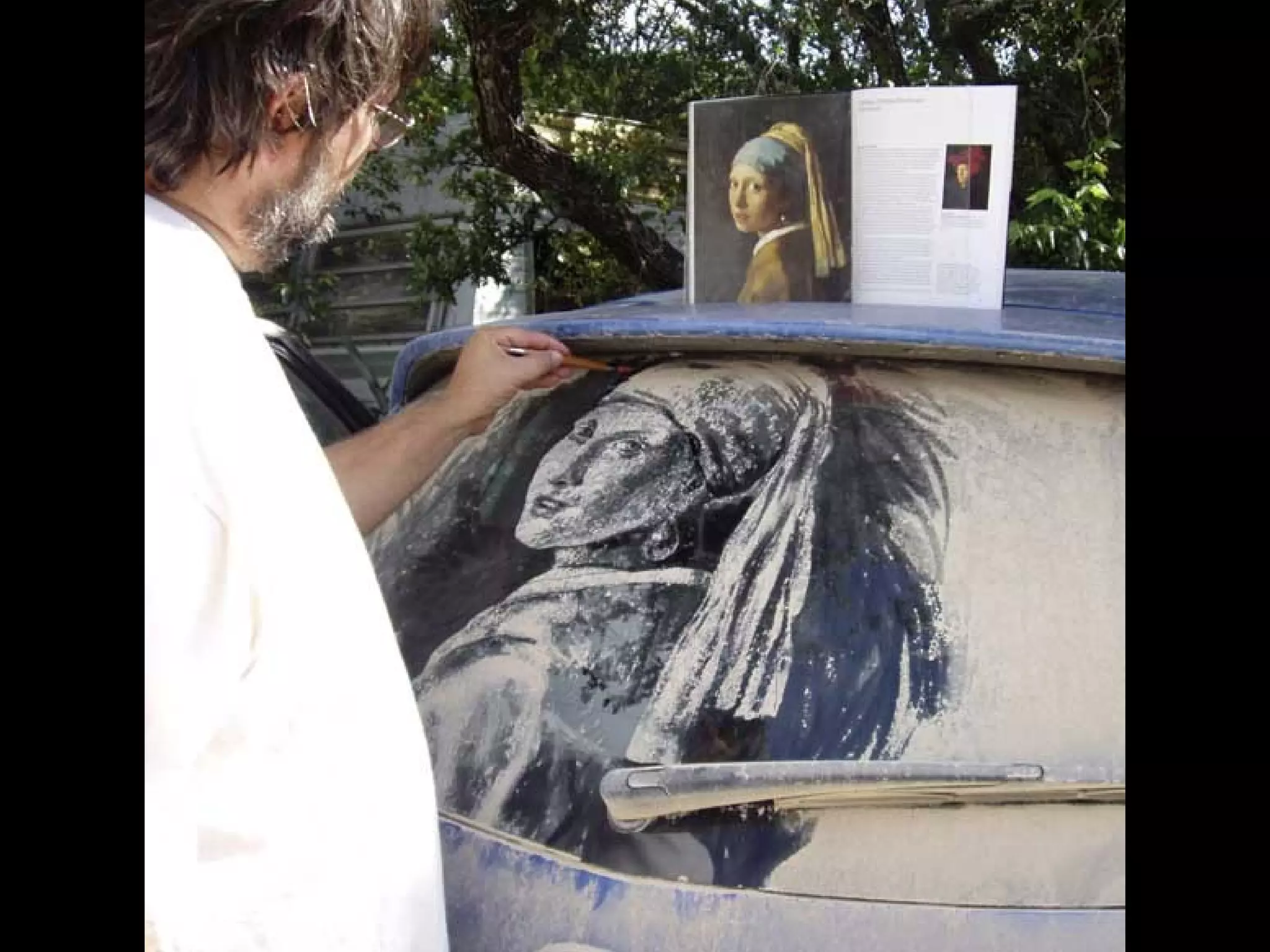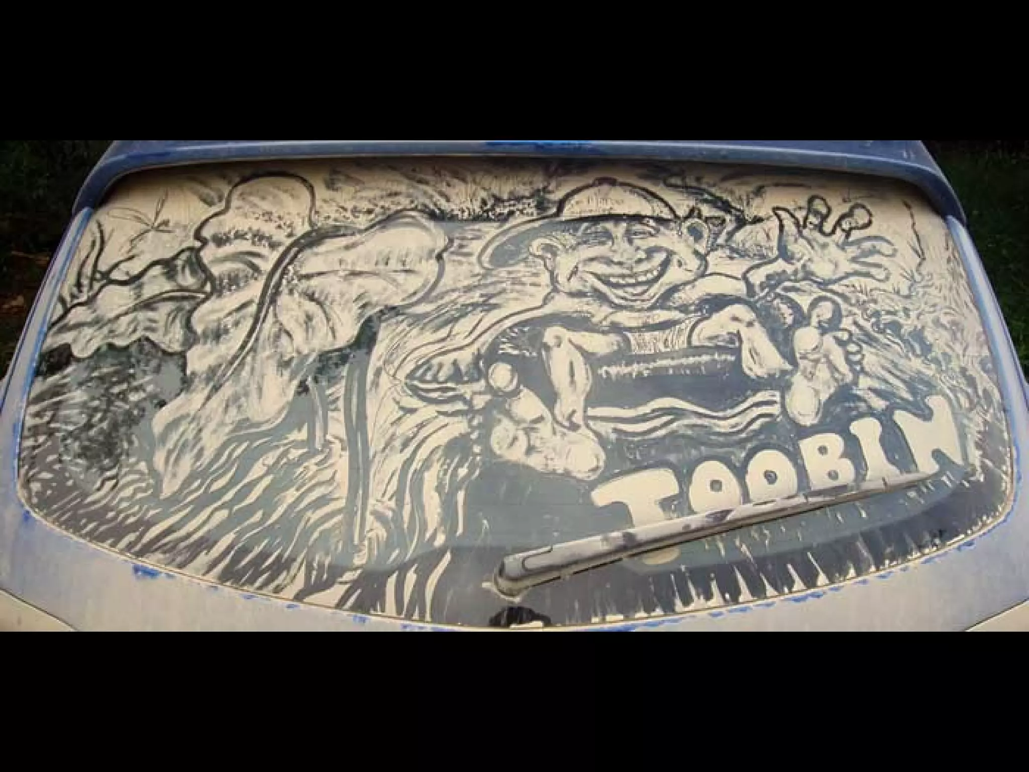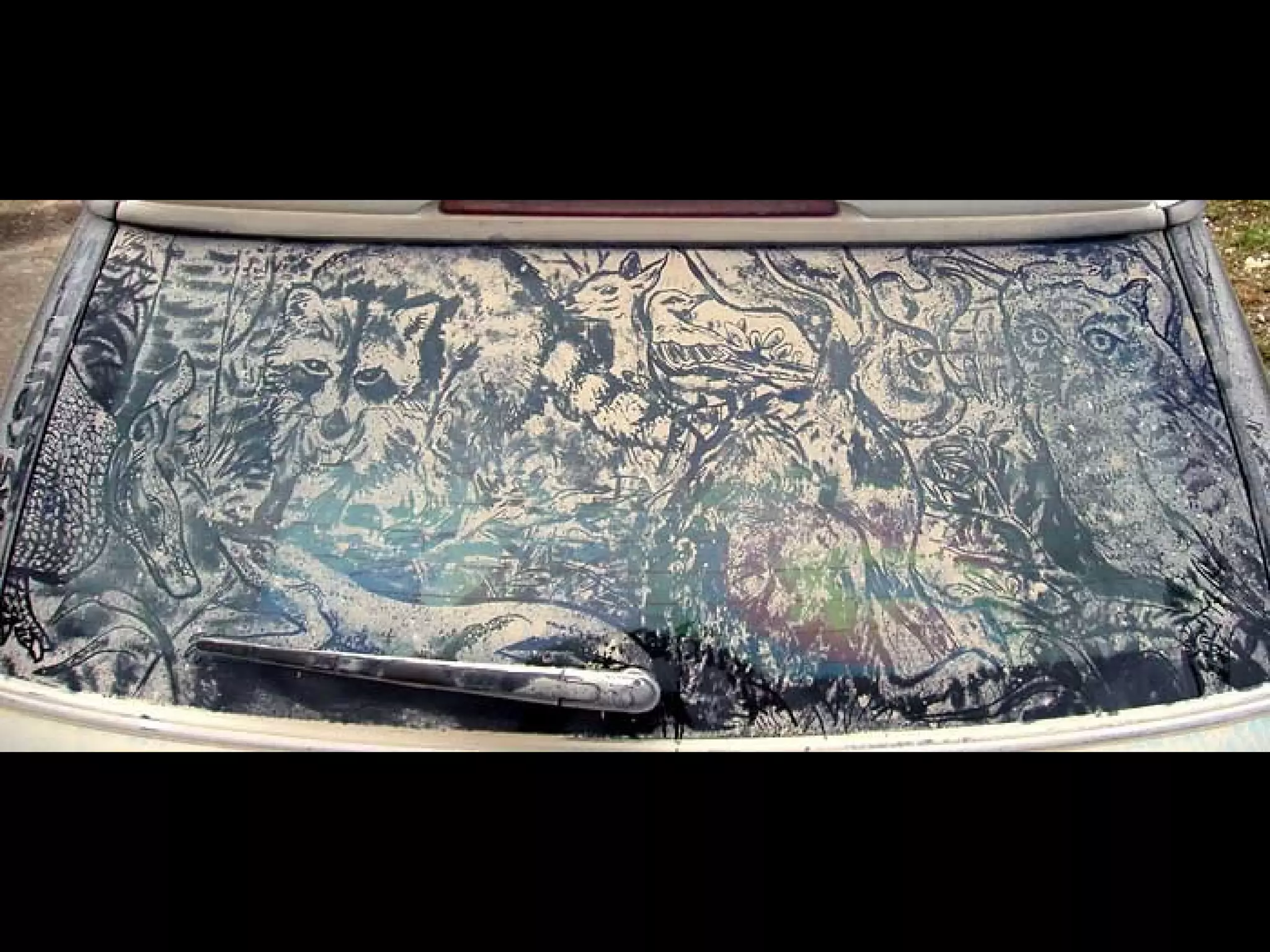 El documento presenta las opciones de lo que se puede hacer cuando se encuentra un coche con los cristales sucios, y luego introduce a Scott Wade, un hombre que dibuja obras de arte famosas en los cristales sucios de los coches que encuentra en lugar de escribir mensajes o hacer dibujos simples. Muestra algunos de sus dibujos, incluida una copia del cuadro "A Friend in Need" de C.M. Coolidge y una combinación de la "Mona Lisa" de Da Vinci y "Starry Night" de Van Gogh.