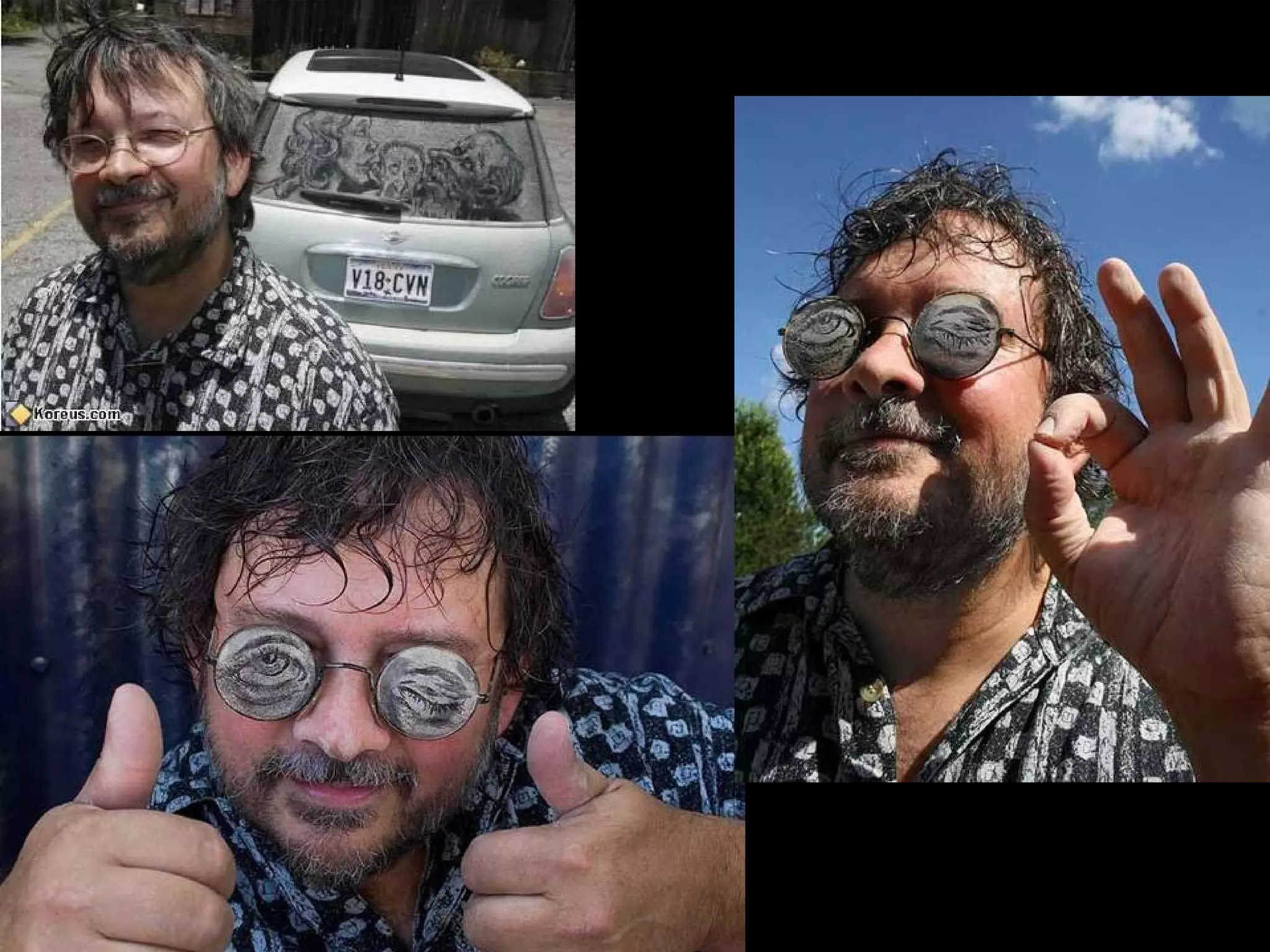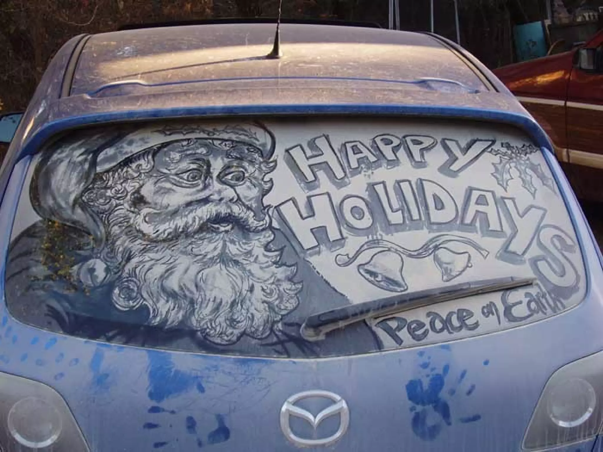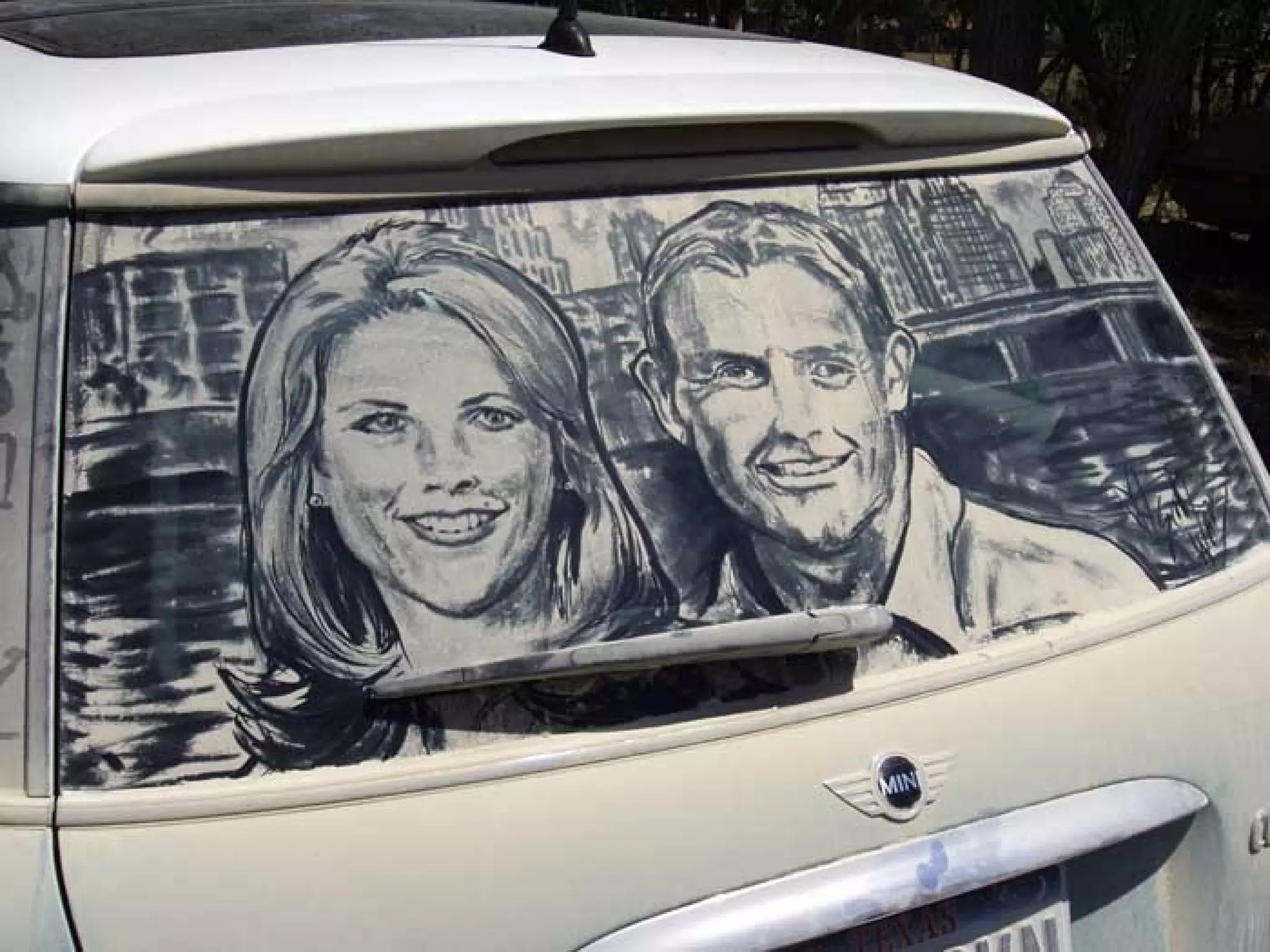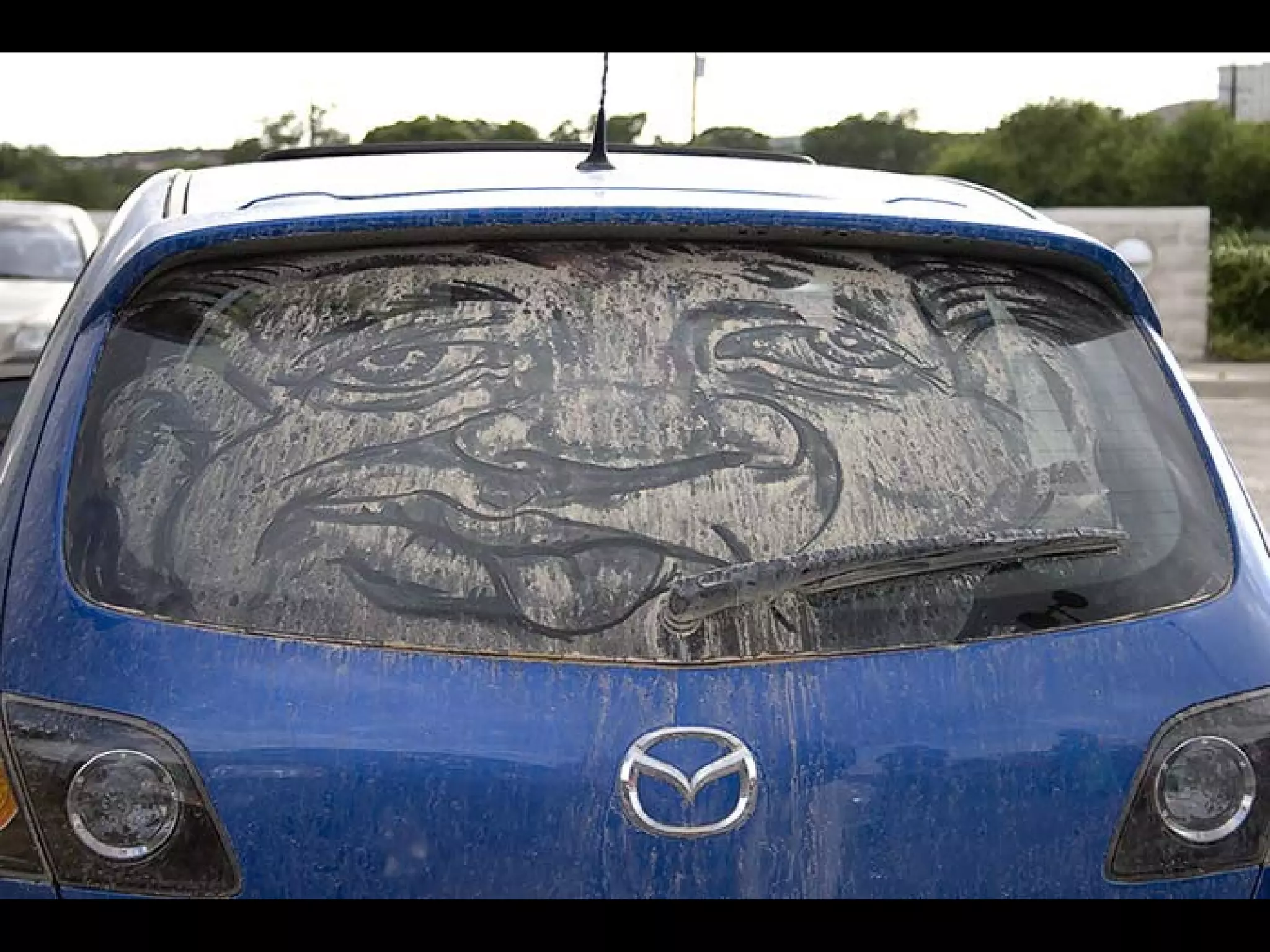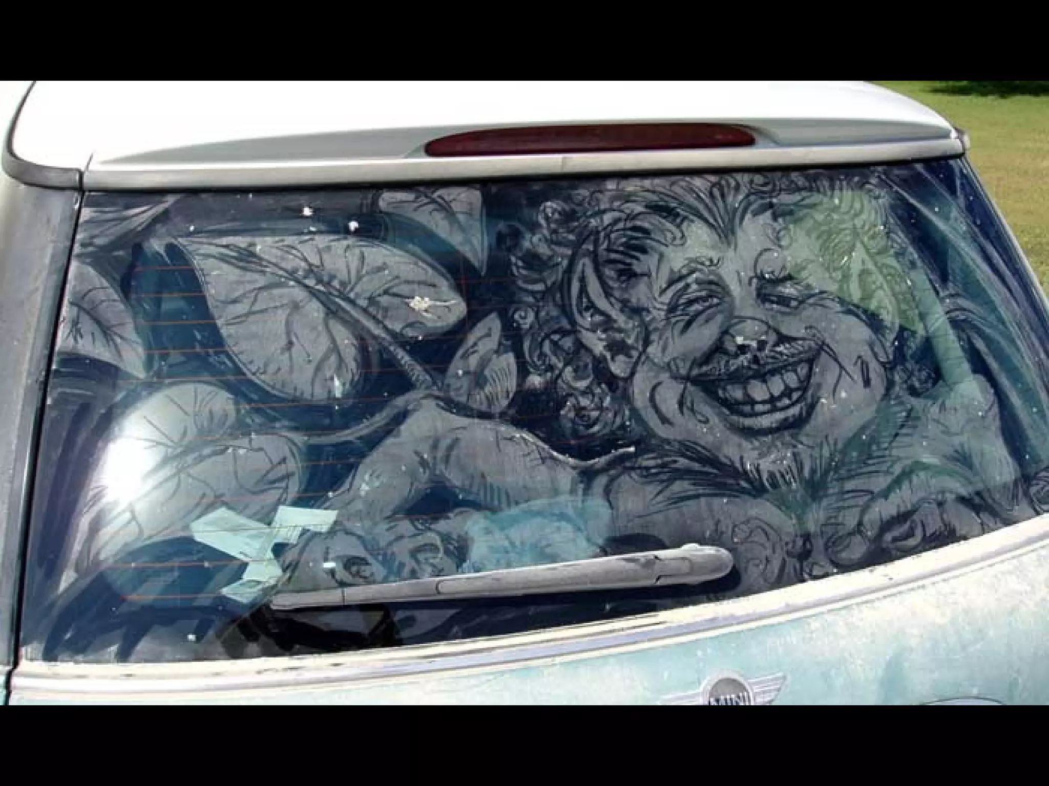 El documento presenta las opciones de lo que se puede hacer cuando se encuentra un coche con los cristales sucios, y luego introduce a Scott Wade, un hombre que dibuja obras de arte famosas en los cristales sucios de los coches que encuentra en lugar de escribir mensajes o hacer dibujos simples. Muestra algunos de sus dibujos, incluida una copia del cuadro "A Friend in Need" de C.M. Coolidge y una combinación de la "Mona Lisa" de Da Vinci y "Starry Night" de Van Gogh.