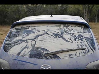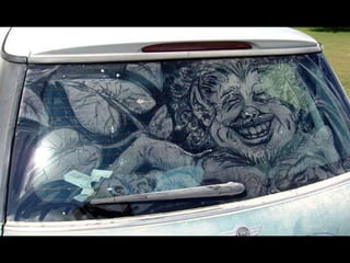 El documento presenta las opciones de lo que hacer cuando se encuentra un coche con los cristales sucios y luego describe las obras de arte que Scott Wade dibuja en los cristales sucios de los coches que encuentra, incluyendo una copia del cuadro "A Friend in Need" de C.M. Coolidge y combinaciones de obras maestras como la "Mona Lisa" de Da Vinci y "Starry Night" de Van Gogh.