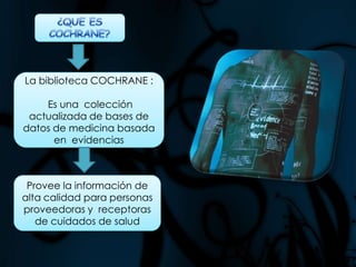 La biblioteca Cochrane provee una colección actualizada de bases de datos de medicina basada en evidencias. Creada en 1972 por Archie Cochrane, la biblioteca contiene revisiones sistemáticas de ensayos clínicos que ofrecen información de alta calidad para proveedores y receptores de cuidados de salud. La biblioteca permite realizar búsquedas simples, avanzadas o por términos MeSH para encontrar revisiones relevantes.