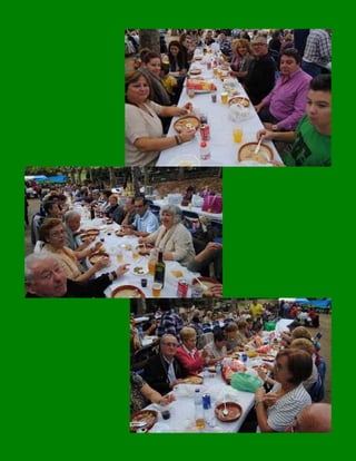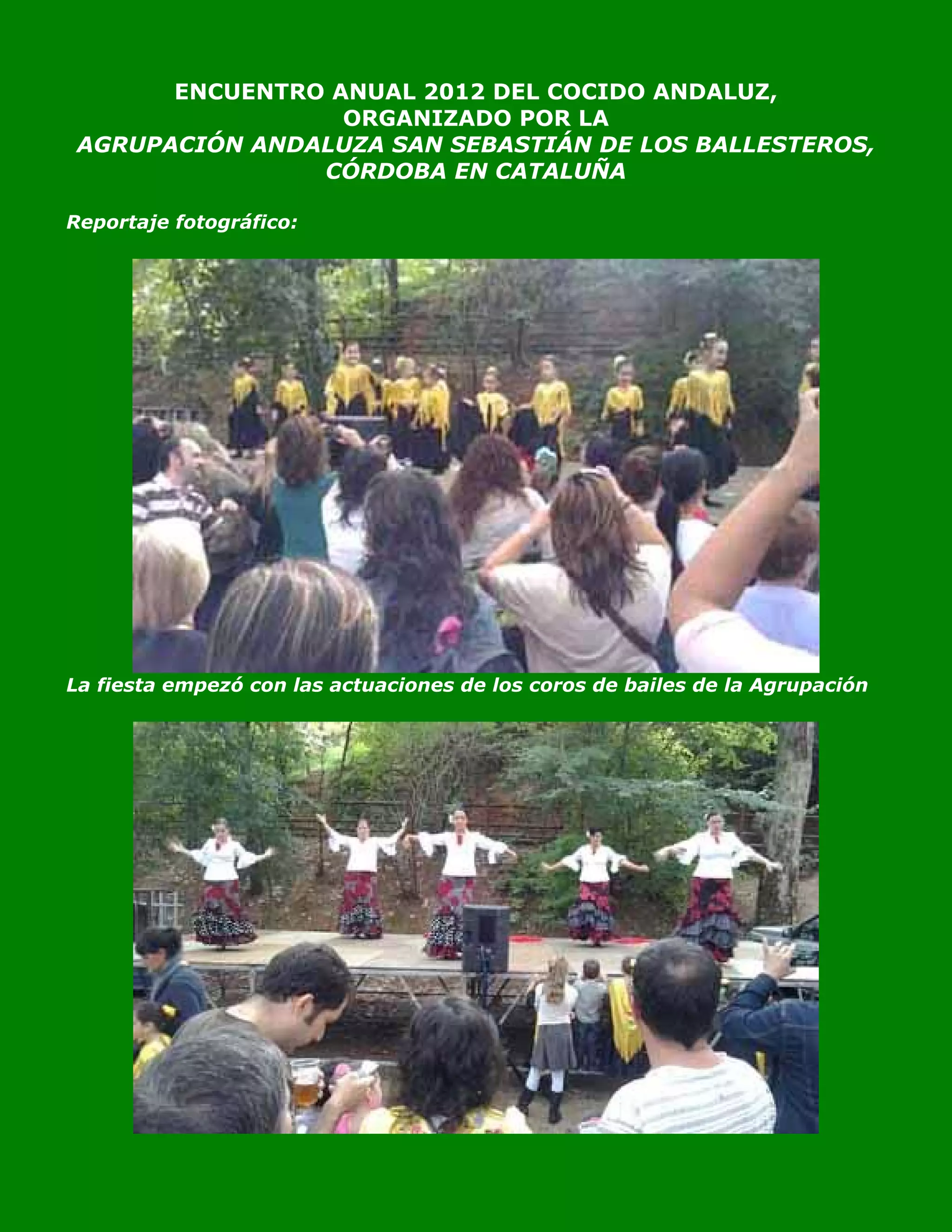 El resumen del documento es el siguiente: La Agrupación Andaluza San Sebastián de los Ballesteros organizó su encuentro anual en Cataluña, donde hubo actuaciones de coros, la preparación de un cocido cordobés para más de 400 personas que generó colas interminables, y finalmente la degustación compartida del plato típico y el baile colectivo por sevillanas a pesar de algunos chubascos.