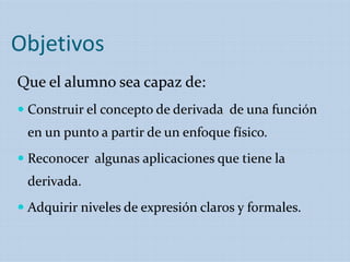 Este documento presenta los objetivos y contenidos de una unidad sobre derivadas. Los objetivos incluyen construir el concepto de derivada desde un enfoque físico, reconocer aplicaciones y adquirir expresión clara y formal. Los contenidos cubren velocidad media, cociente incremental, pendiente de rectas tangentes y derivadas. El documento también presenta los destinatarios y contenidos previos requeridos.