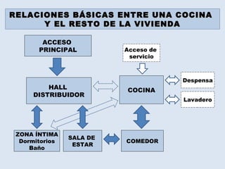 Este documento proporciona pautas sobre el diseño básico de cocinas, incluyendo la organización de áreas funcionales, esquemas comunes de diseño, dimensiones recomendadas para zonas de circulación y trabajo, y consejos generales sobre la distribución de espacios.